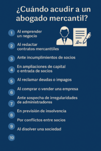 Es recomendable contratar a un abogado mercantil cuando necesites asesoramiento en la creación de una empresa, redacción de contratos, resolución de disputas comerciales o cualquier asunto legal relacionado con la actividad empresarial.